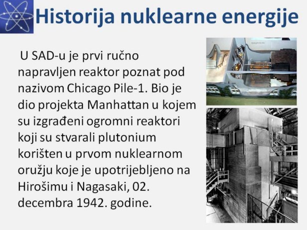U SAD-u je prvi ručno napravljeni reaktor poznat pod nazivom “Chicago Pile-1”. Bio je dio projekta Manhattan u kojem su izgrađeni ogromni reaktori koji su stvarali plutonium korišten u prvom nuklearnom oružju koje je upotrijebljeno na Hirošimu i Nagasaki. |