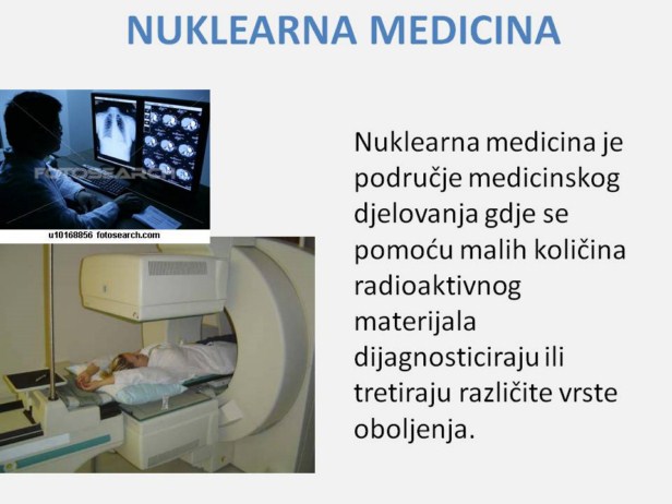 Nuklearna medicina ili procedure radionukleotidnog procesiranja su neinvazivne i često bezbolne medicinske procedure koje olakšavaju ljekarima dijagnosticiranje medicinskih stanja. Tehnologija je bazirana na radioaktivnim materijalima koji se nazivaju radiofarmaceutici ili radiomarkeri. Ovisno o vrsti tehnike, radiomarker se aplicira intravenozno, guta ili udiše u vidu plina i onda se akumulira u području organa u kojem otpušta energiju u obliku gamma zraka. Energija se registrira uređajem pod nazivom gamma kamera (PET) bilo PET skenerom i/ili PET sondom. Ovi uređaji povezani su s kompjuterom koji mjeri količinu apsorbovanih radiomarkera i projicira sliku s detaljima strukture i funkcije organa ili tkiva. U nekim medicinskim centrima, radiološki nalazi se mogu upotpuniti prikazima poput kompjuterske tomografije (CT) ili magnetne rezonance (MRI) koji pružaju posebni uvid u stanje što se često naziva ko-registracija. Ovakav pristup omogućava prikupljanje i upoređivanje informacija dobijenih na dva različita načina, te doprinosi obuhvatnijim i preciznijim dijagnozama. U posljednje vrijeme, razvijaju se posebne vrste uređaja: kompjuterska tomografija pojedinačnom fotonskom emisijom/ kompjuterska tomografija (SPECT/CT) i pozitronska emisiona tomografija/ kompjuterska tomografija (PET/CT) koji pružaju istovremeni prikaz oba načina. Nuklearna medicina pruža i terapijske procedure, poput liječenja radioaktivnim iodinom (I-131) koji ima primjenu u tretmanu karcinoma i drugih medicinskih stanja vezanih za štitnu žlijezdu. www.thelancet.com/series/nuclear-medicine http://en.wikipedia.org/wiki/Nuclear_medicine