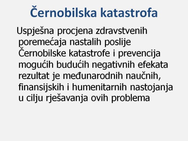 Černobilska katastrofa Černobilska katastrofa bila je predmet brojnih studija: Ukrajinsko-američka studija obolijevanja od leukemije i povezanih bolesti kod radnika na dekontaminaciji, Francusko-njemačka studija incidence leukemije kod djece i odraslih iz različitih oblasti Ukrajine, Međunarodni konzorcij za istraživanja uticaja radijacije na zdravlje- studija slučaja leukemije kod djece Ukrajine, Bjelorusije i Rusije; Ukrajinsko-bjelorusko-američka studija karcinoma tiroidne žlijezde kod djece; Ukrajinsko-američka studija vidne sposobnosti; Preliminiarna studija karcinoma dojke kod stanovnika kontaminiranih područja Bjelorusije, Rusije i Ukrajine.