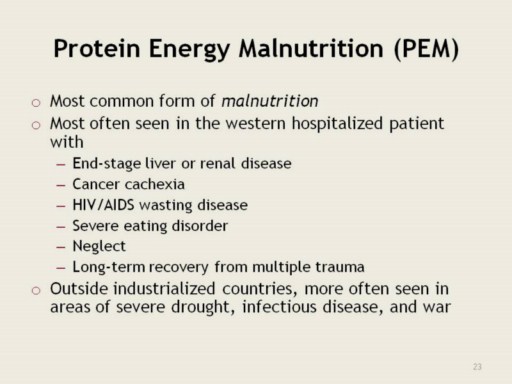 Includes a wide spectrum of clinical manifestations Infants and young children Associated with poverty, cultural and social issues, maternal malnutrition, infectious disease, and poor weaning practices from breast to bottle One study showed that over half of all deaths of children between 6 months and 5 years of age were due to PEM’s potentiating effects on infectious disease Basch et al. Am J Public Health. 1994; 84: 814-8. Severity varies