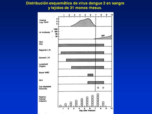 Infección tisular por virus dengue 2 hace pico justo después de que la viremia termina. La permeabilidad vascular en humanos ocurre a la mitad del tiempo en que termina la viremia (desaparición de la fiebre) y la infección celular es máxima basada en el modelo de monos (Marchette et al JID 128:23-30, 1973; Halstead SB in Schlesinger WR Togaviruses Academic Press NY 1980. pp 107-73).