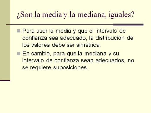 Para calcular el intervalo de confianza de una mediana, es necesario sólo calcular la probabilidad de que los datos de la muestra, estén agrupados simétricamente alrededor de la verdadera mediana. Existen tablas publicadas para el intervalo de confianza de una mediana. Ya habiendo localizado la mediana, las tablas listan los valores correspondientes al límite inferior y superior del intervalo de confianza. |