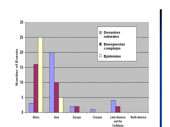 Asia está en mayor riesgo de desastres y África para emergencias complejas. Connolly A, Gayer M, Ryan M, Salama P, Spiegel P, Heyman D. Communicable diseases in complex emergencies: impact and challenges. The Lancet, 364, 9449: 1974 – 1983, 2004 |