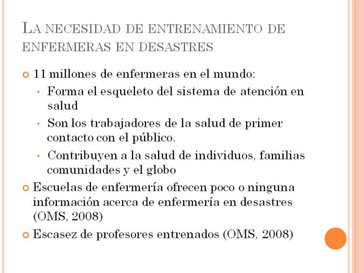 Organización Mundial de la Salud (2008). Integrando la preparación y respuesta a emergencias en el currículo de Licenciaturas de Enfermería. Ginebra, Suiza |