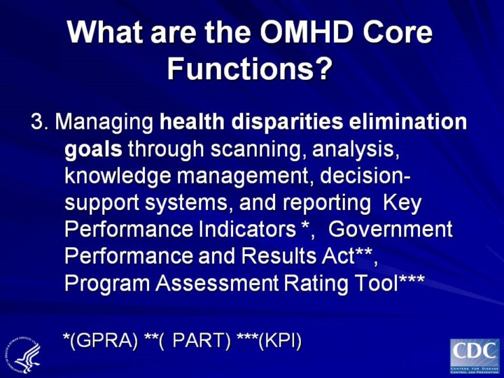 What are the OMHD Core Functions? 3. Managing health disparities elimination goals through scanning, analysis, knowledge management, decision-support systems, and reporting Key Performance Indicators *, Government Performance and Results Act**, Program Assessment Rating Tool*** -- Mobilizing resources and advocating for health disparities elimination programs -- Aligning use of resources with accomplishment of health disparities elimination goals *(GPRA) **( PART) ***(KPI)