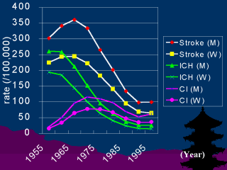 Since 1965, we observed dramatic decline in stroke mortality in both men and women. Intracranial hemorrhage (ICH) started to decline around 1960 and cerebral infarction (CI) started to decline around 1970.