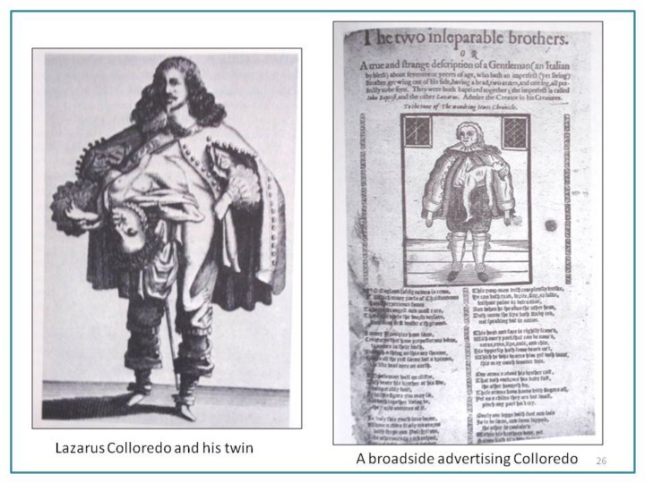 Parents of a disabled infant could often expect hundreds of people to visit their child, and many profited from the experience by charging an admission fee. Infants who survived could expect a life on display. Since beggars often faked injuries for sympathy, skeptics who had paid the admission price were allowed to touch and thoroughly investigate the individual.38 Even after death, preserved or mummified individuals were placed on display. Lazarus Colloredo’s life offers a wonderful example. Born with a parasitic twin attached to his abdomen, Colloredo made his living by traveling across Europe. After printing broadsides to raise publicity, he displayed himself and his twin for all those willing to pay the admission price. Colloredo visited small towns and royalty throughout the 17th century.39