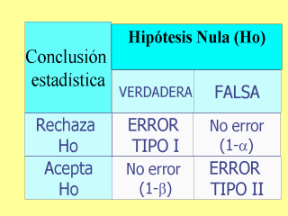 del estudio y el nivel de significancia estadística. Como ya se dijo el error tipo se presenta cuando se rechaza la hipótesis nula siendo esta verdadera; y se produce el error tipo II cuando se acepta la hipótesis nula siendo esta falsa en realidad. |