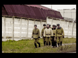 | Soldiers walk by the concrete fence that