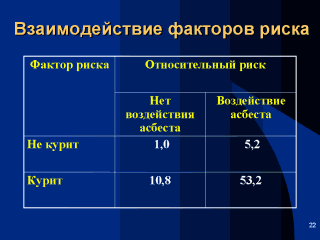 Риск развития рака легких многократно увеличивается среди курящих и подвергающихся воздействию асбеста. Измерение этого взаимодействия имеет прямое значение для разработки профилактических программ. Исключение курения среди работающих с асбестом приводит к большему эффекту, по сравнению с другими группами курильщиков.