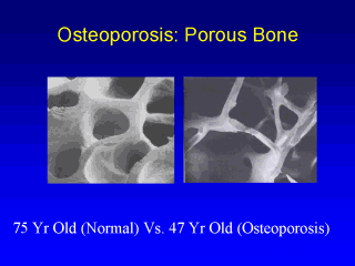 | Literally osteoporosis means porous bone. Fractures associated with osteoporosis are a debilitating and frequently fatal health problem in older adults. However, they can occur even in younger adults and are not an inevitable result of aging. |