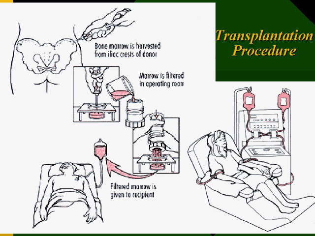 | Transplantation procedure: The transplantation procedure is relatively straightforward. Patients are given high doses of chemotherapy and/or total body irradiation. The marrow is then aspirated from the iliac crests of an HLA-compatible donor and infused IV into the patient. Patients are severely pancytopenic until engraftment, usually within 2 to 3 wk after reinfusion of the marrow. |
