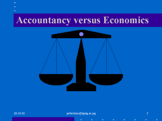 Accounting is the skill to manage money effectively, to provide a record of transactions which can be audited and to achieve a balanced budget over time. It is about the efficient administration of systems to ensure this e.g Payroll Stock control Payments and receipts Capital programmes Asset Inventory Planned programme maintenance Economics is the science of resources, planning their use and measuring the impact of use in financial terms. Economics is about predicting resource use and costs, on the basis of past activity and modelling in various assumptions. It is about spending resources to maximise benefit. In health service terms-maximising health. Health Economics is the particular branch of economics which is concerned with health matters. |