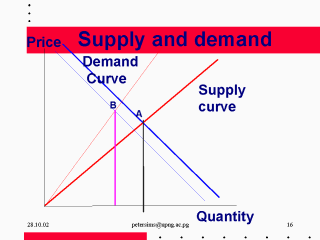 so Demand increases. The Quantity Supplied will be determined by Price-provided there is a Demand, the higher the Price the greater will be the Quantity Supplied as more manufacturers enter the market place to make a profit. Demand and Supply will come into equilibrium point at say A when the Quantity Supplied will be exactly taken up by the Demand in the market place for that Price. If Demand or Supply changes then there will be a different line for Supply and for Demand meeting at a new point of equilibrium B. The slope of the Demand curve is a measure of Elasticity, I.e. the extent to which Demand is altered by a change in Price. Maximum elasticity is when the line is at an angle of 45 degrees. In Rationing there is a fixed Quantity supplied,Taxation adds a fixed sum to the Market Price. |