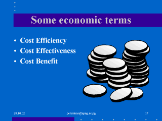 curve. Cost effectiveness is about doing things that work- measles immunisation provides 95% protection against measles when given to the right person at the right time with a vaccine of demonstrable power to trigger an antibody response. It is Cost Effectiveness when Measles works, not just in the laboratory or clinical trial - that is Cost Efficacy - but daily, weekly, monthly in the clinics and hospitals around the world despite problems of record keeping, cold chain, professional skill, parental trust …. and in consequence Measles outbreaks are reduced and fewer CHILDREN DIE. Thus there is a Cost and a Benefit Equation The Cost is the Cost of the Vaccine manufacture, test, purchase, transport plus the Cost of the Staff-training, salary plus the Costs of Administration - Clinics, staff, needles, syringes, record keeping. The Benefit is the Number of Children who are immunised and the implication for Morbidity and Mortality from Measles in that same population. This may be estimated in financial terms and thus Cost and Benefit compared in the same unit of money. |