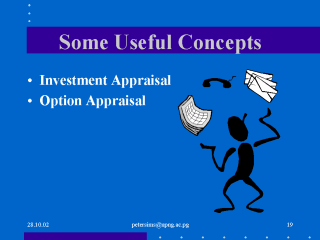 benefits. e.g. A Hospital rebuilding programme Capital Costs versus Increased efficiency of a modern building, opportunity to perform to a higher standard, more effective use of staff time, patient access, staff morale etc. etc. Option Appraisal examines 3 or 4 possible solutions to a problem and scores each against key weighted factors like Value for Money Health Gain Professional acceptability Politics etc. A scoring system enables a global score to be produced for each option and then for them to be placed in priority order according to that scoring. It also provides a transparent system of decision making and a decision trail which can be retraced and re-examined if conditions change. |