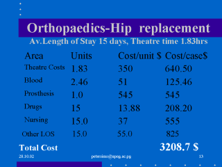 to illustrate the costing of a particular procedure and high lights the high cost areas. Theatre time The prosthesis Nursing care It attempts to put each category into a Unit of known cost and then by multiplying the units used by the unit cost and summing the result obtaining a cost for a case. It uses average costs per unit. Notably the largest area is “other” and accounts for 25% of the total. |