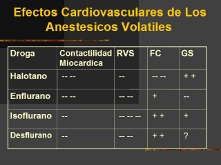 no bloqueada por los primeros. Los anestésicos volátiles han sido usados en forma segura tanto en cirugía valvular como de coronarios. Aunque existen reportes de una redistribución del flujo coronario con isoflurano (robo coronario) en el modelo animal de estenosis coronaria, sin embargo en el humano recientemente demuestran su uso en forma segura sin que se presente este fenómeno. Los anestésicos volátiles pueden ser usados intercalados en la circulación extracorpórea (vaporizador en línea) al causar vasodilatación y mejorar el recalentamiento; actualmente existen métodos más seguros para este fin como son los vasodilatadores de pronta acción y rápida eliminación . + Aumento ligero, ++ Aumento moderado, – Disminución ligera, – – Disminución moderada, – – – Gran disminución. RVS= Resistencia vascular sistémica, FC= Frecuencia cardíaca, GC= Gasto cardíaco. |