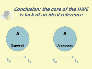 | According to Olli Miettinen; (see the slide) the best reference for a population under study at spicific time is the same population without the exposure at the same time . This is impossible so Miettinen considered the HWE problem as a comparison problen because of non using an ideal reference group. He also mentioned that if we find an ideal reference group then the HWE will not exist. |