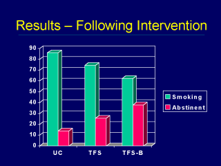 This bar graph represents the percentage of subjects in each group who self-reported smoking or abstinence following the delivery of the 8 week intervention.