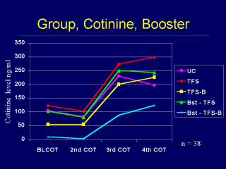 to the saliva cotinine levels at the 4 data time points. Again, the sample size for this analysis is small, but the trends indicate the relapse noted with CO measurements and self-report. However, in this measurement, the trend was for the TFSB-booster group to have lower mean Cotinine levels. |