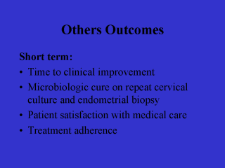 | We also had a series of secondary outcomes which included short term outcomes like how long it took a women to clinically improve; whether she was in fact cured of her Gonorrhea or Chlamydia if we found it on the initial examination; whether her endometrial biopsy cleared up, and we actually repeated the biopsy and cultures at 30 days; whether she was satisfied with her medical care; how she adhered to her treatment. |