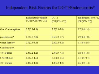 of that method. - All types of contraception were categorized on the basis of use in the past 4 weeks. Our data from the PEACH study, and these have been published, suggest pretty much the same thing. Oral contraceptives certainly don’t reduce the risk of upper genital tract infection/endometritis, but they actually seem to be reducing the tenderness score, which is the amount of tenderness. But obviously this is not statistically significant. We did have the opportunity to look at barrier methods of contraception and other methods. We found that there was no method of contraception that actually reduced the risk of UGTI/endometritis, so that was the bad news. |