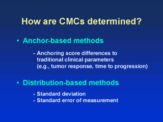 methods: (McMaster Univ. group, Guyatt et al.; Osoba and colleagues) Anchoring means matching or drawing a correspondence. You can also anchor differences to clinical parameters at a single time point (I.e., baseline levels of disease symptoms or performance status) Distribution-based methods: SDs can be observed at a single time point or we can look at SDs of changes in HRQoL over time. SEM: The margin of error that can be expected in an individual’s score due to unreliability in the measurement. The amount of error that obscures the true score. 1 SEM has been recognized as providing a reasonable estimate of a CMC. Wyrwich et al. |