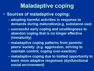 Maladaptive coping can take many forms. The defining feature of all maladaptive coping is that it either results in more problems for the person or repeatedly places the person back into similar situations which present the same coping challenges, such as dysfunctional relationships or substance abuse.