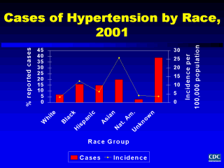Another way we can summarize surveillance data is by the race of individuals. Our example looks at the chronic disease of hypertension. Of the 307 cases of hypertension, the greatest percent of cases with known race occurred among Asians. When we calculated the incidence of disease (to take into account differences in racial distribution within our population), we still observed that Asians had the highest incidence for hypertension. This data summary led us to ask questions that required additional, special data analyses such as: Why was there a disproportionate burden of hypertension among Asians when compared with people of other race groups? Does this disproportionate disease burden suggest environmental and behavioral differences? Differences in provider disease reporting practices, access to medical care, diagnostic testing, or other factors? Also note that for nearly two-fifths of the cases reported to our surveillance system, race was unknown. This suggested incomplete case investigation efforts and thus, an area in which our surveillance system needed to be improved. As you can see, summaries of surveillance data tell us about disease burden, which in turn informs us about the need for additional information about cases and data analyses. In this situation, the next step would be to obtain information on race for the 39% of cases for whom this information was missing, recalculate the incidence of hypertension for each race group, then target the race group with the highest incidence for immediate intervention efforts. |