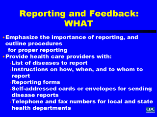 When providing feedback on surveillance information, it is useful to emphasize the importance of case reporting and foster an awareness of reporting requirements. Efforts should be made to increase the awareness of everyone who reports suspected cases of disease to your surveillance system of the proper procedures for case reporting . These individuals and groups should be provided with: - re adable, up-to-date copies of lists of the diseases that should be reported along with detailed instructions explaining how, when, and to whom to cases should be reported;- case investigation and reporting forms that are simple, clear, and available in colors that allow photocopying or transmission by fax; - self-addressed, postage paid cards or envelopes for sending disease reports to you; and - telephone and fax numbers for reporting cases and making inquiries for information from the local health authorities overseeing the surveillance system. In an effort to make case reporting as simple as possible let people know that an answering machine will be available to take messages outside regular business hours. |
