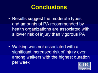 of activity. In particular, walking was not associated with a significant risk of injury among women, even among walkers with the highest duration of activity per week. |