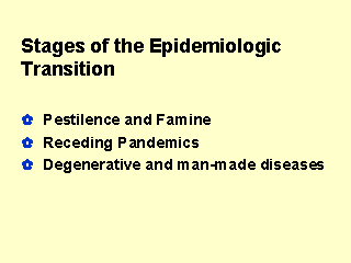 La mayoría de los países se encuentran en el estadío de patrón de enfermedades degenerativas y de aquellas producidas por el hombre, o en camino a alcanzar dicho patrón en forma rápida. |