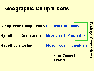 La introducción de los estudios de caso-control en las comparaciones geográficas es una poderosa herramienta. Si el factor está fuertemente asociado con la enfermedad en una población dada en un estudio de casos- controles, y esta relación es consistente en diferentes poblaciones, es probable que pueda estar finalmente relacionado con las causas de la enfermedad. |