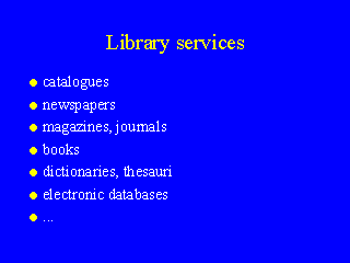 Internet can transmit many “classic” library services: access to catalogs, reading of journals. It can offer also the electronic library services: searching through databases and in addition it can offer the special electronic information services e.g. electronic offer or electronic shopping. |