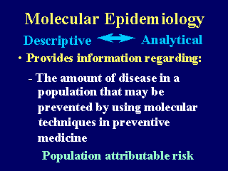 Linking descriptive and analytical molecular epidemiology studies also permits an evaluation of the population attributable risk (i.e., amount of disease in a population that could be prevented by intervening on the specific molecular marker under evaluation). This information is also essential for preventive medicine and public health approaches. |