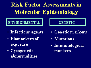 Unlike genetic epidemiology, molecular epidemiology is concerned with susceptibility genes, as well as infectious agents and environmental risk factors. |