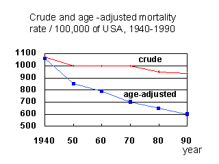 If you take the age into consideration, whose procedure is called age-adjustment, the mortality rate goes down from 1940 to 1990 dramatically. Age adjustment is to make the outcome of populations, whose composition of age are different, comparable. These slides indicate that the total number of death per unit stayed