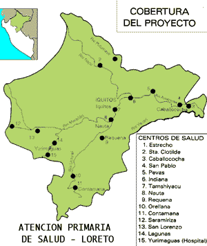 A map of Peru and Loreto, site of the Primary Health Care - Loreto project, of the Universidad Peruana Cayetano Heredia (through its Instituto de Medicina Tropical Alexander von Humboldt) and the Direccion Regional de Salud Loreto; the project is funded by the Danish Red Barnet (Save the Children, Denmark) and DANIDA (Danish Agency for Development), and has its headquarters in Iquitos. |