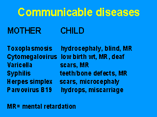 Toxoplasmosis: Careful manipulation of soil, cats, and uncooked meat. The cat is the only definitive host of Toxoplama gondii parasite, and its feces can contaminate soil, sand, and objects. Another source of infection is meat contaminated with toxoplasma cysts. Seronegative pregnant women must be immunological checked monthly, and the detected seroconversions medicated to avoid fetal contamination. Cytomegalovirus: test blood for transfusion. Syphilis: prophylaxis of venereal diseases, VDRL, treatment of positive Varicella: avoid crowded places. Herpes simplex: prophylaxis of venereal diseases, Cesarean delivery to prevent baby infection |