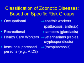 Certain occupations or activities are associated with a greater likelihood of exposure to a potentially zoonotic organism. Also, some individuals are more susceptible than others to infection once exposed. The AIDS virus and immunosuppresive therapies for cancer, organ transplantation, etc., create a growing population of susceptible individuals.