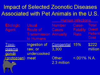 Infectious agent: Toxoplasma gondii, a coccidian protozoan. Occurrence: Worldwide, in mammals and birds. Human infection is common. Reservoir: Definitive hosts of T. gondii are cats and other felines. Intermediate hosts of T. gondii include sheep, goats, rodents, swine, cattle, and birds. Mode of transmission: By eating raw or undercooked infected meat containing tissue cysts, or by the ingestion of infective oocysts in food or water contaminated with feline feces. Transplacental infection in humans occurs when a pregnant woman has rapidly dividing tachyzoites (a form of the parasite) in the bloodstream. Children may become infected by ingesting infective oocysts from dirt in sandboxes, playgrounds, and yards in which cats have defecated. Incubation period: From 5 to 20 days. Methods of control and prevention: Cook meats to 150 degrees F. before eating. Education and sanitary practices concerning handling of raw meats. Wash hands thoroughly before eating and after coming in contact with soil and cat litter pans.