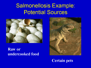 Identification: Salmonellosis is a bacterial disease commonly manifested my an acute inflammation of the intestine, with sudden onset of headache, abdominal pain, diarrhea, nausea, and sometimes vomiting. Dehydration, especially among infants or the elderly, may be severe. Fever is almost always present. Anorexia and diarrhea often persist for several days. Occasionally, the infectious agent may localize in any tissue of the body, producing abscesses and causing septic arthritis, inflammation of the gall bladder, inflammation of the heart valves, or pneumonia. Deaths are uncommon, except in the very young, the very old, the debilitated and the immunosuppressed.
