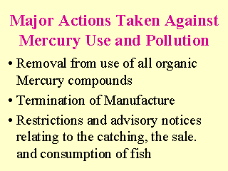 Recent Control changes in Japan: Prohibition of the use of all organic mercury compounds for all agricultural seed dressings and the use of mercury for electrolysis in the chlor-alkali industry. |