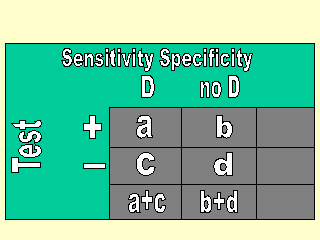 effective is the test in being positive with this disease (a)/(a+c) Think of your sensitive fingertips probing for something and finding it. The specificity means how effective is the test in being negative when people dont have the disease (d)/(b+d) i.e. it is the diagonal opposite of sensitivity. |
