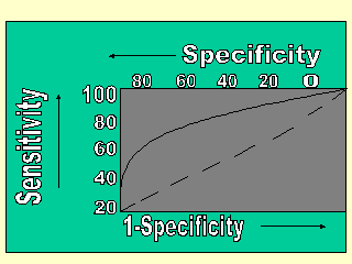 of the picture and 1- (one minus) specificity increasing to the right at the bottom. This
