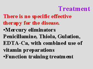 administered via intravenous drip infusion in the early stage of the disease. The eliminators used in Iraq methylmercury poisoning were D-penicillamine, N- acetyl- DL- penicillamine, thiol resin, etc. |