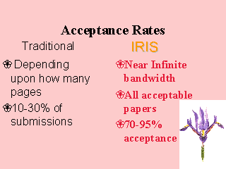Studies from the BMJ indicate that only 15% of the submissions are accepted, however, of all the articles submitted 70-80% are eventually published. This is an enormous waste of reviewer and contributor time. A IRIS approach would be to accept all the articles passing the initial screen as there is almost unlimited bandwidth.