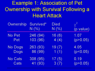 From: Pet Ownership, Social Support, and One-Year Survival After Acute Myocardial Infarction in the Cardiac Arrhythmia Suppression Trial. Friedmann E, Thomas SA. 1995. Am J Cardiol 76:1213-1217. - Significance: These data confirm and extend previous findings relating dog ownership to increased survival among patients with myocardial infarction, while controlling for cat ownership, physiologic status, and other psychosocial factors, including social support. - It was previously suggested that healthier people are more likely to own pets, thus confounding the relationship between pet ownership and survival following a heart attack. However, in this study, there is no evidence that differences in physiologic status between dog owners and non-dog owners were responsible for the increased survival among dog owners. The physiologic profile of dog owners was comparable to that of non-dog owners. |