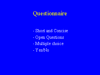 Questionnaires must be short and concise . Too many questions bore the responder and can induce wrong answers just to annoy back the interviewer. If the question is not going to be used in the analysis, why ask them in the first place? Open questions are difficult to code. Multiple choice can induce the answer, can lead to bias. Yes/No questions limit the scope of the responses. |